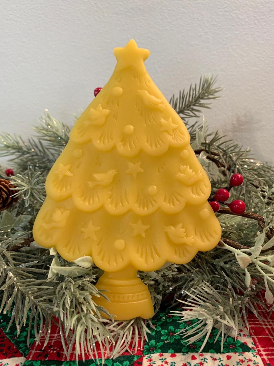 This beautiful beeswax Christmas Tree is hand poured in a vintage mold from 1998 named Tannenbaum.