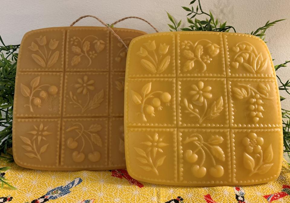 This lovely larger pure triple filtered beeswax tile has nine different fruits and flowers with a charming border between them all.