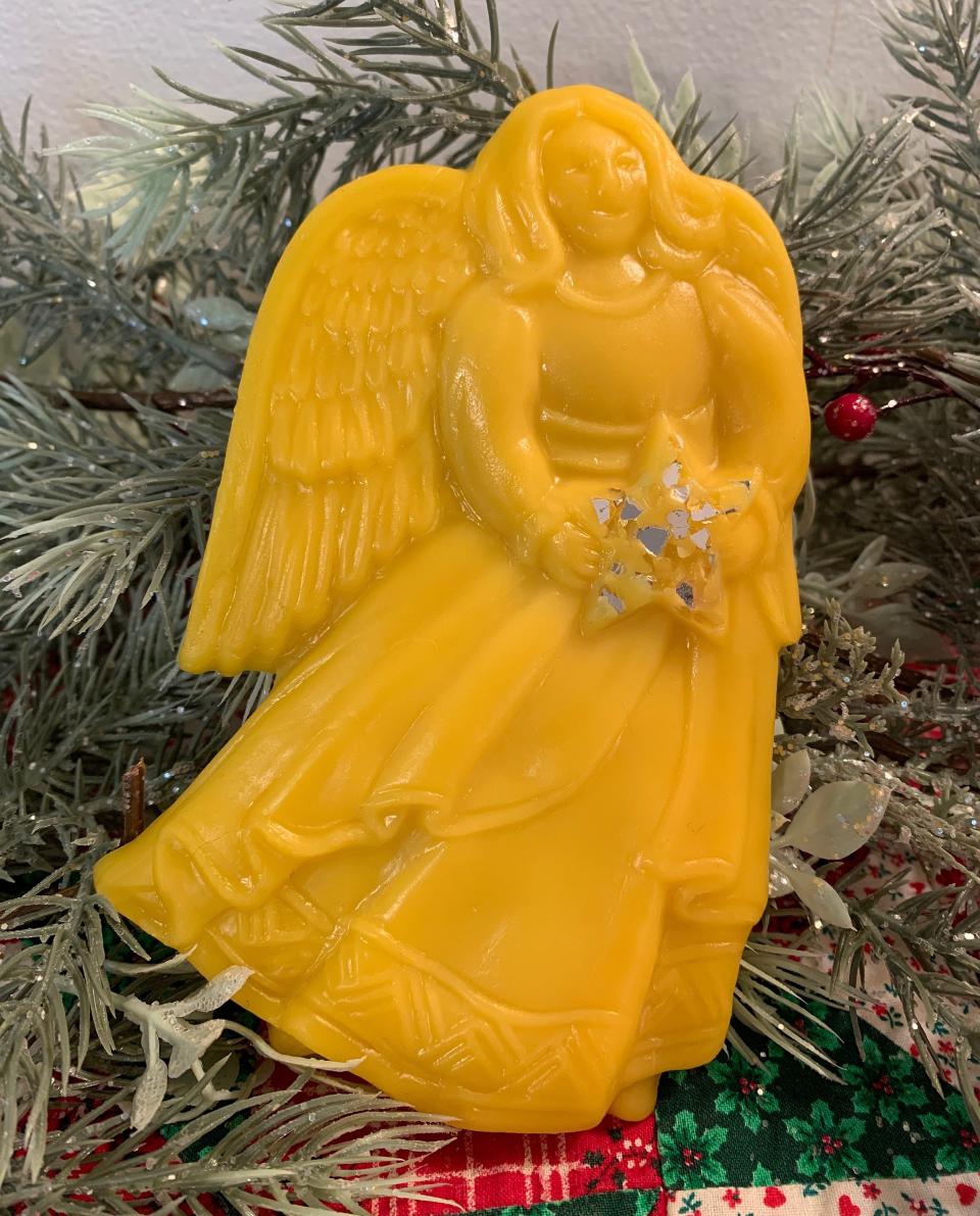 A beautifully detailed beeswax Angel carrying a bright star which you may choose to have embellished with crushed glass, or perhaps you would like to paint her!
