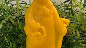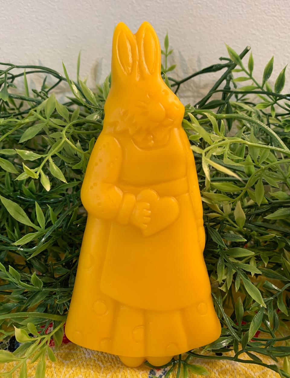 Crafted from 100% pure beeswax, Mrs. Rabbit is hand poured from a vintage mold from 1989, while Farmer Rabbit is a bit younger, his mold is from 1992.