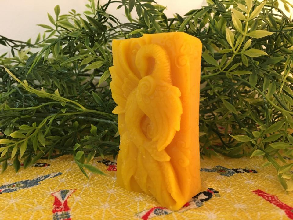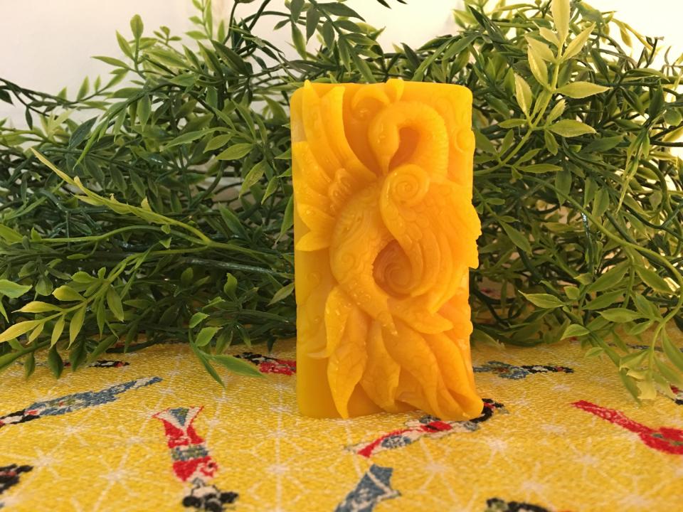 The Peacock Beeswax Art piece has such amazing detail! I love how the scroll work wraps around the sides of the beeswax block!